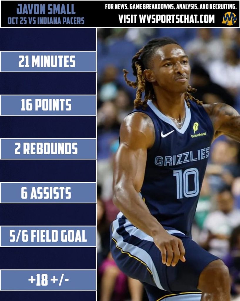 Rookie guard Javon Small had a career night for the Memphis Grizzlies in a 128-103 win over the Indianapolis Pacers.